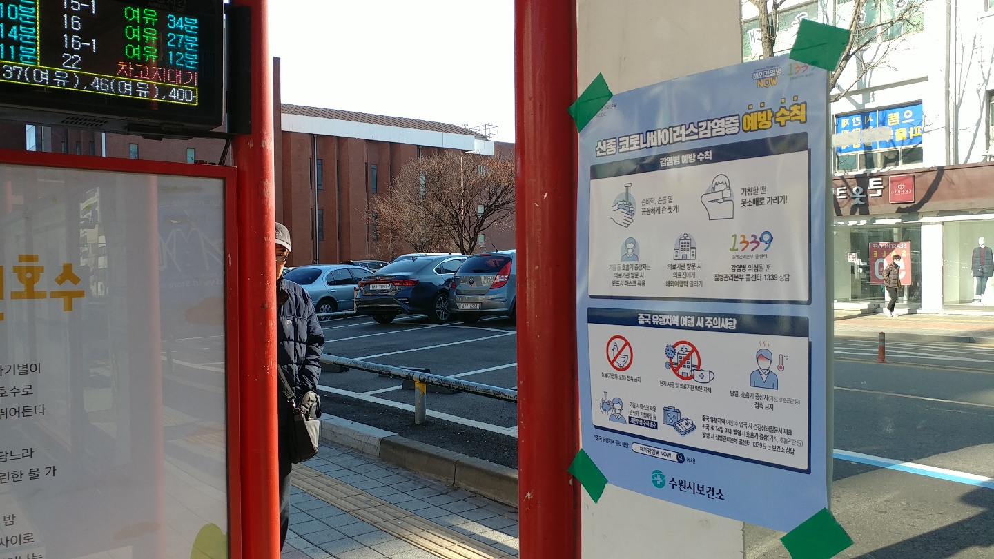 버스정류장에도 코로나바이러스감염증 예방 수칙이 부착되어 있습니다. 많은 시민들이 마스크 착용에 동참하고 있고요.