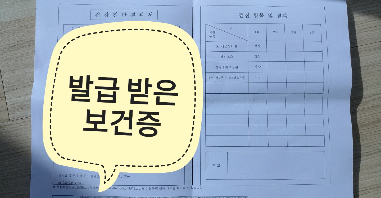 발급받은 보건증 입니다. 받자마자 카페 사장님한테 제출하였습니다.