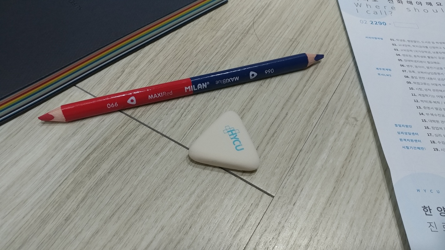 잘지워질 것 같은 지우개와 어떻게 보관해도 보관 케이스가 더러워 질 것 같은 양면 색연필이다.