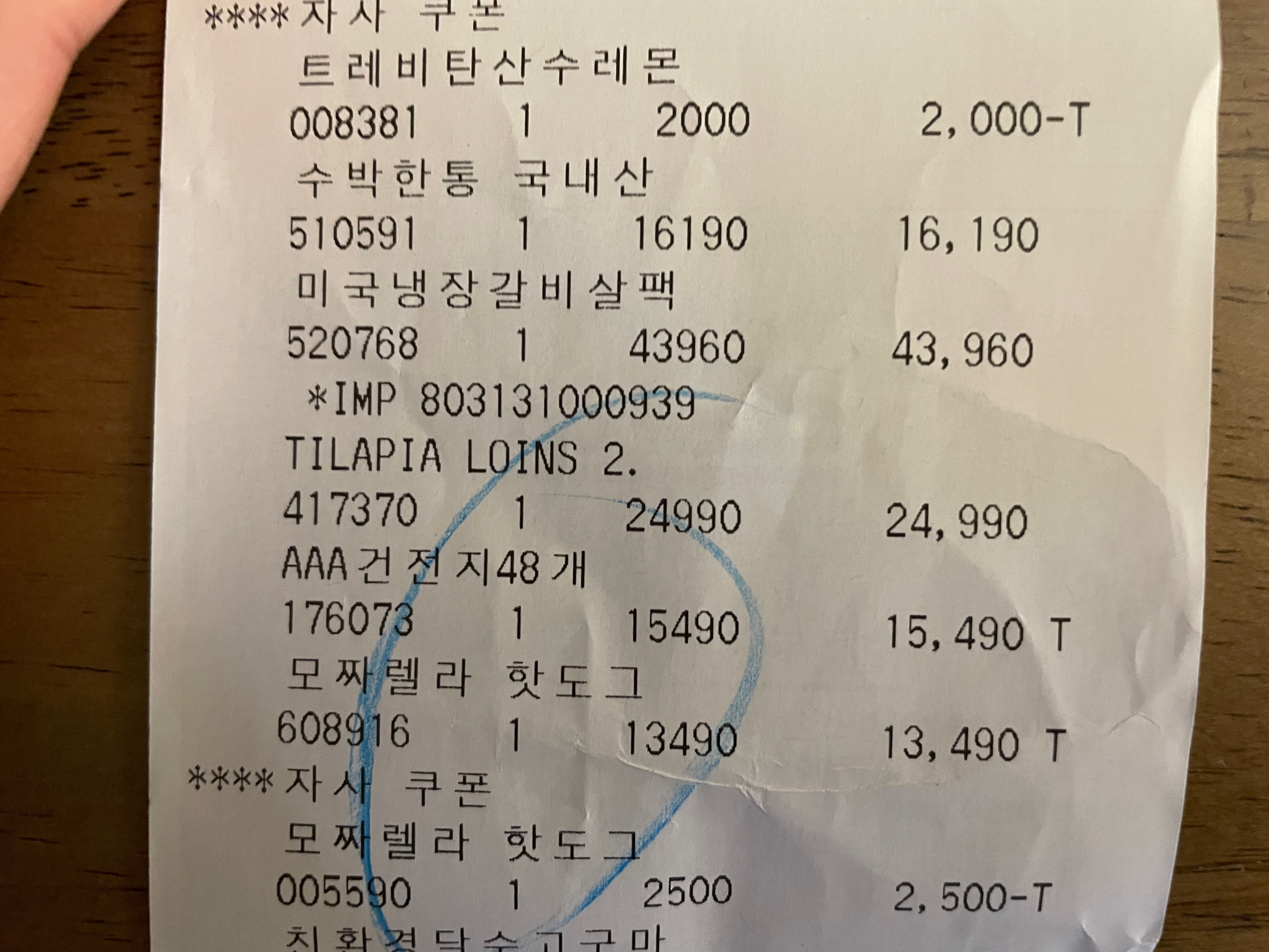 영수증에 영어로 TILAPIA 라고 되어 있다. 한봉다리에 2만5천원 정도 하는데, 안에 8개가 개별 포장되어 있다. 1개 가격은 3125원 정도이다. 원래 9개가 들어 있었고 가격도 2만 1원 정도 했는데 물가가 많이 올랐다. 냉동으로 판매하고 있어서 오래 보관하기 편리하다. 해동도 금방 된다. 닭가슴살보다 빠르다.