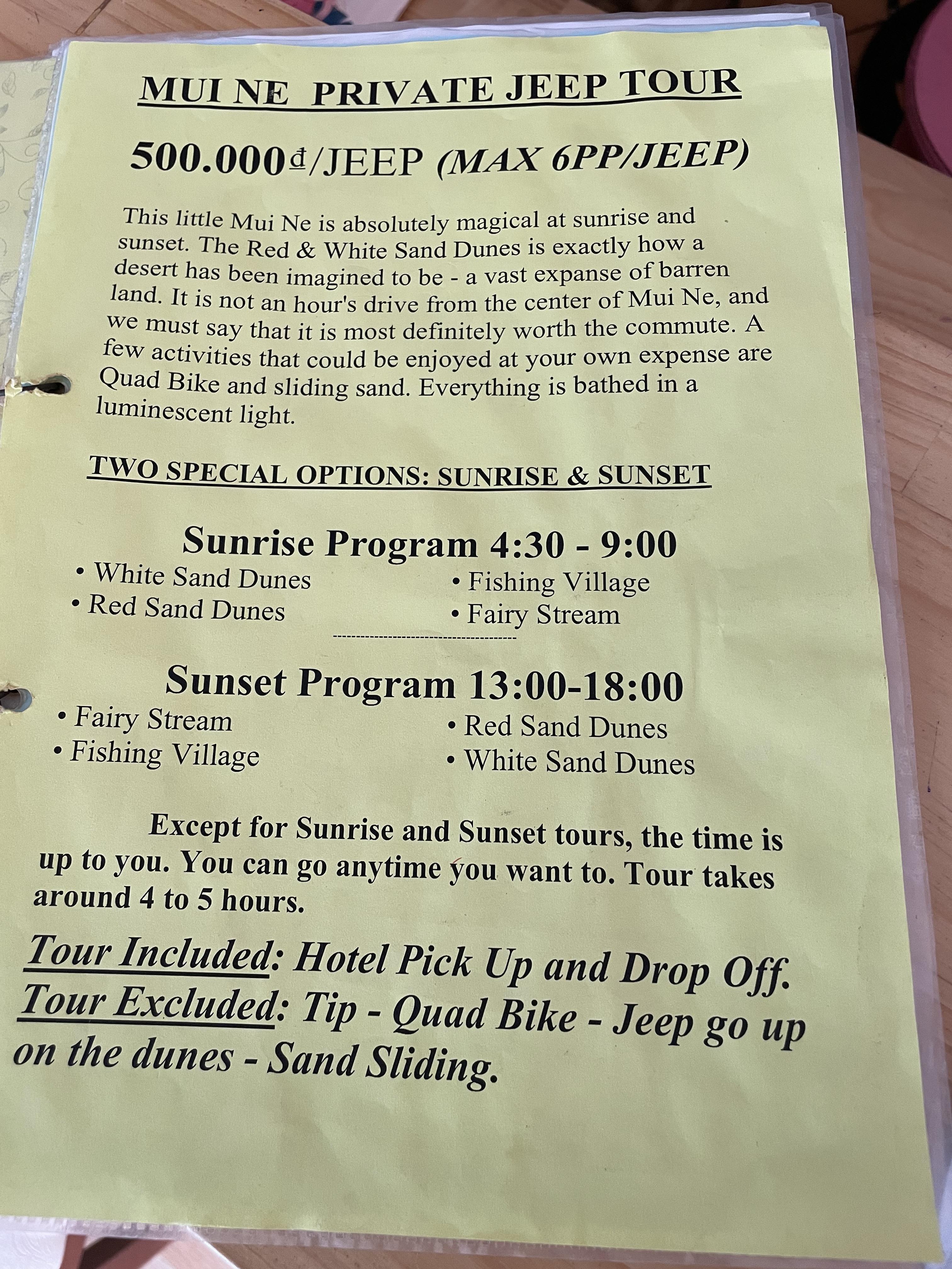 그래서 저희는 무이네에 도착해서 하루를 쉬고 그 다음날 아침에 출발하는 무이네 지프투어 선라이즈 투어를 신청했습니다. 30대 중반이 되니 아무래도 몸을 사리게 됩니다.